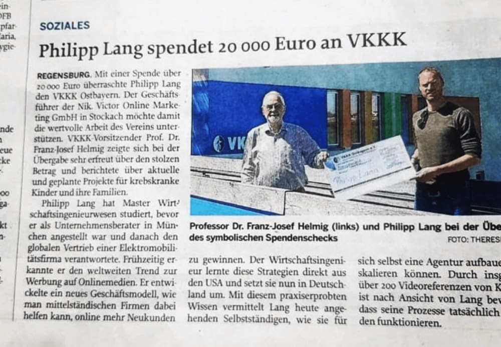 „The secret of living is giving!“ sagte Tony Robbins zu mir und so durfte ich auch die Erfahrung machen, 20.000€ an den „Verein zur Förderung krebskranker und körperbehinderter Kinder“ zu spenden.